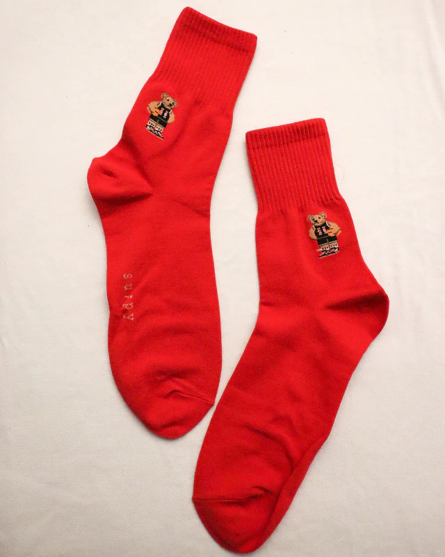 Meia de fundo vermelho com estampa de ursinho que joga basquete
